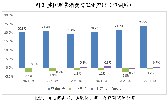 根据美国商务部的数据,10月季调后美国零售消费同比增长16.1%,与2019年月均零售消费相比增长了23.8%,为疫情暴发以来最高。即使考虑到物价上涨的因素,美国零售数据表现依然强劲;与2019年均值相比,10月美国消费者价格指数(季调后)仅上涨8.2%。