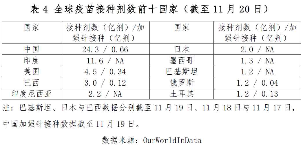根据OurWorldInData的数据,截至11月20日全球新冠肺炎疫苗接种76.9亿剂,过去一周新增接种1.88亿剂;从累计接种数来看,中国疫苗加强针接种(0.66亿剂)依然领先。