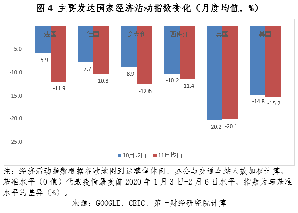 10月中旬以来发达国家疫情出现反复,给经济活动带来一定负面影响,特别是欧洲发达国家。根据谷歌地图的数据,与10月相比,主要发达国家(除英国)经济活动指数均有所下降;下降幅度最大的是法国,已超过6个百分点。