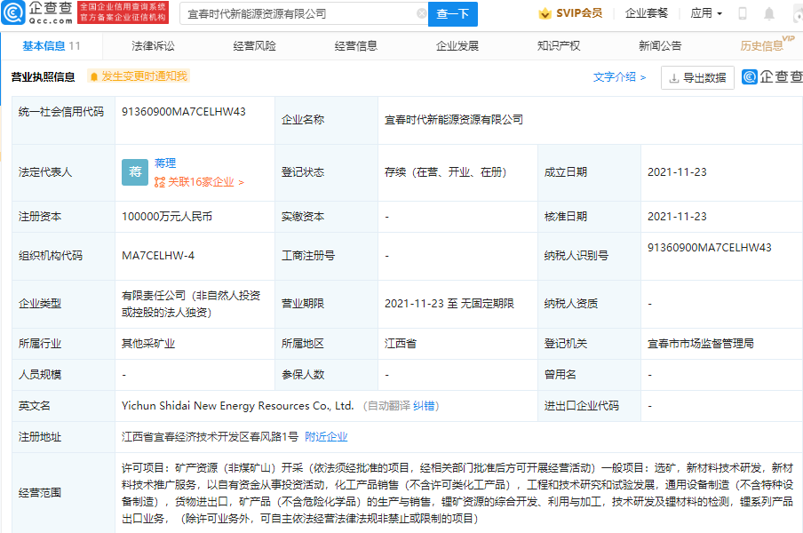 企查查APP显示,11月23日,宜春时代新能源资源有限公司成立,法定代表人为蒋理,注册资本10亿元人民币,经营范围包含:矿产资源(非煤矿山)开采;选矿,新材料技术研发;新材料技术推广服务等。