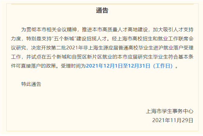 11月29日,上海市学生事务中心发布通知,为贯彻本市相关会议精神,推进本市高质量人才高地建设,加大吸引人才支持力度,特别是支持“五个新城”建设招揽人才。经上海市高校招生和就业工作联席会议研究,决定开放第二批2021年非上海生源应届普通高校毕业生进沪就业落户受理工作,并试点在五个新城和自贸区新片区就业的本市应届研究生毕业生符合基本条件可直接落户的政策。受理时间为2021年12月1日至12月31日(工作日)。