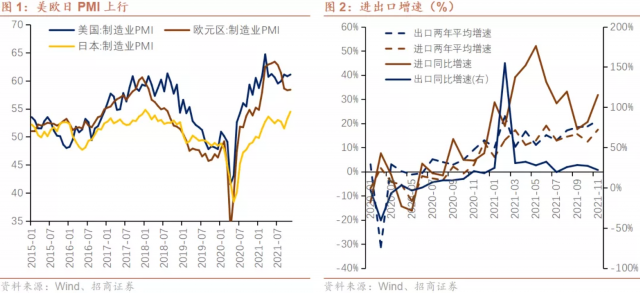 11月出口同比回落,环比上涨8.4%,两年平均增速上升至21.2%。主要关注以下几点:一是,发达经济体生产需求并未走弱。欧美日PMI指数维持高景气区间,对欧美日出口量环比仍增长,意味着发达经济体生产需求相对旺盛,同比增速下行主要是基数导致。二是,delta影响逐步弱化,omicron病毒影响尚未体现,在此情形下,新兴经济体需求改善明显,对东盟出口拉动作用明显增强即是佐证,数据显示11月对东盟出口增速22.3%(前值18.0%)。三是,年底消费旺季。虽然目前海外财政补贴政策逐步退出,居民收入和消费逐步回归正常化水平,但疫情反复使得防疫物资、线上办公等消费需求保持景气。四是,随着疫情影响趋弱,产业链复苏带动加工贸易,11月进料加工出口额创近6年来新高,录得742亿美元。
