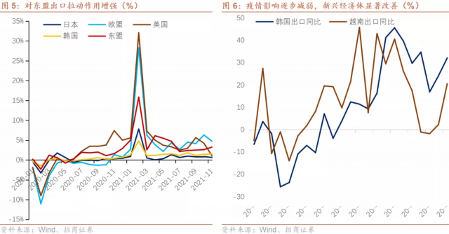对新兴出口增速维持较高水平,对发达经济体出口增速走弱,或意味着全球复苏格局中新兴经济体带来边际作用在上升。数据显示,11月对俄罗斯、印度、东盟、印尼、南非等经济体出口增速维持高位,分别收录37.5%、34.0%、22.3%、53.6%和25.9%,而对美国、日本、加拿大等经济体出口增速均跌破10%。韩国出口增速一直以来被作为观测全球新兴经济体需求景气度的风向标,11月韩国出口显著回升至32.1%,说明疫情逐步受控情形下,当前全球产业链复苏已从以美日发达经济体扩散到新兴经济体。同时,东盟疫情影响趋弱,越南出口增速快速反弹回升。截止2021年10月,日本、印度、墨西哥、巴西等经济体出口分别录得9.4%、43.1%、0.01%和27.9%。