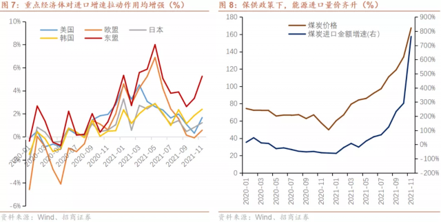 11月进口高增超预期,主要关注以下几点:一是,从国内基本面来看,生产维持景气度区间,较10月有所改善,部分行业仍在加库存。二是,商品价格仍维持高位,下游需求虽有所放缓,但整体量降价升。冬季煤炭需求旺盛供应紧张,“保供政策”下加大煤炭进口。三是,疫情影响趋弱,新兴经济体产业链修复,加工贸易带来进口增加。数据显示,我国从东盟进口对增速拉动作用显著,主要原因或是东盟受疫情影响程度减弱,生产恢复稳定供应。11月,原油、铁矿石、钢材、铜材、汽车、大豆等进口均出现不同程度增长或改善,其中原油、钢材高增长,分别录得80.1%和23.7%;铁矿石、铜材、大豆由负转正,分别录得1.9%、27.0%和27.1%;汽车改善明显,收录-2.1%(10月-46.8%)。受国内保供政策影响,11月煤及褐煤进口金额同比增长762.6%,其中进口量3505万吨,同比上涨198.1%。