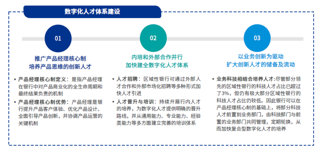 数字化人才是银行数字化转型的基石,是具备创新能力的、兼具业务知识及科技能力的复合型人才。对区域性银行而言,需要建立数字化领导者、数字化应用人才、以及数字化专业人才这三方面的数字化人才队伍,从上至下推动全行数字化变革。其中,数字化领导者需具备数字化领导力与数字化思维;数字化应用人才主要基于不同的业务场景,关注数字化应用技术与业务模式的融合;数字化专业人才即转型过程中的相关专业技术人才。