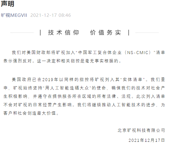 12月17日早间,旷视科技发表声明称,对美国财政部将旷视加入“中国军工复合体企业(NS-CMIC)”清单表示强烈反对。这一决定和相关指控是毫无事实根据的。