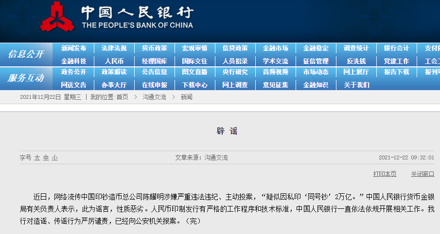 近日,网络流传中国印钞造币总公司陈耀明涉嫌严重违法违纪、主动投案,“疑似因私印‘同号钞’2万亿。”中国人民银行货币金银局有关负责人表示,此为谣言,性质恶劣。人民币印制发行有严格的工作程序和技术标准,中国人民银行一直依法依规开展相关工作。我行对造谣、传谣行为严厉谴责,已经向公安机关报案。