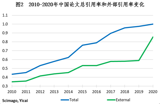 从2020年的比率来看,中国学者在医学研究方面特别强(图3)。他们的总引用率和外部引用率分别为1.24和1.42,表明中国学者的论文质量明显高于美国医学研究者。中国学者在其它四个领域的研究质量相对没有那么高。总引用率和外部引用率的平均值分别为0.76和0.45。