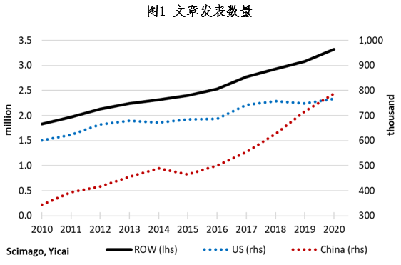 在过去的十年里,学术文章的发表数量大幅增长。根据SCImago的数据,2020年的发表了490万篇,比2010年增长了75%。中国增长的特别快,十年间增长了129%(图1)。事实上,中国的此项排名在2020年位居世界第一,略领先于美国。中国和美国各占世界学术文章发表的16%左右。美国的学术文章发表数量增长相对温和,在过去十年中仅增长了28%,而世界其他地区(ROW)增长了81%。