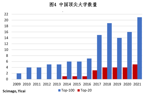 数据显示,随着时间的推移,中国的大学质量不断提高(图4)。2009年,中国仅有两所大学位列SCImago前100名:清华大学(第43名)和浙江大学(第70名)。到2021年,中国有21所大学进入前100名,仅次于美国的42所,远远领先于以7所大学位列第三的英国。