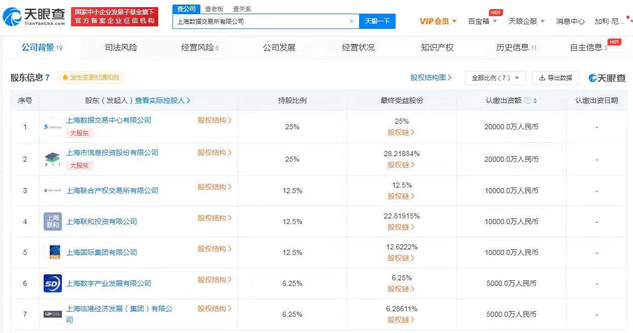 天眼查App显示,近日,上海数据交易所有限公司完成工商注册,其法定代表人为张琦,注册资本8亿人民币,经营范围包括数据商品交易,以及数据商品交易的相关服务等。股东信息显示,该公司由上海数据交易中心有限公司、上海市信息投资股份有限公司、上海联合产权交易所有限公司等共同持股。2021年11月25日,上海数据交易所揭牌成立仪式在沪举行并达成了部分首单交易。