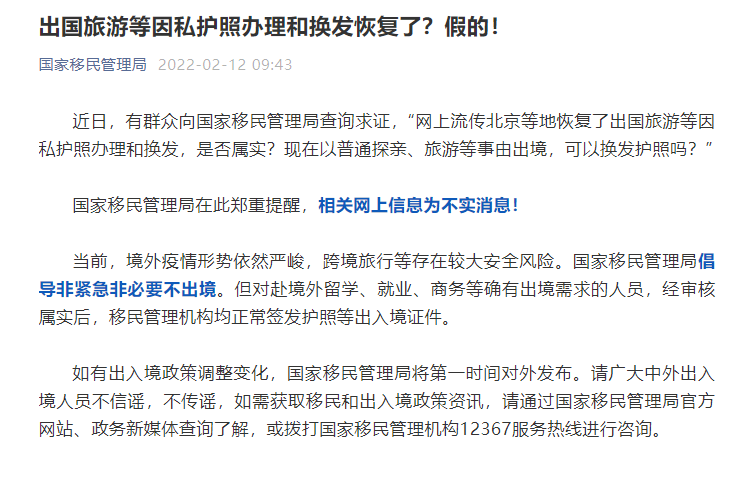 国家移民管理局郑重提醒,相关网上信息为不实消息!