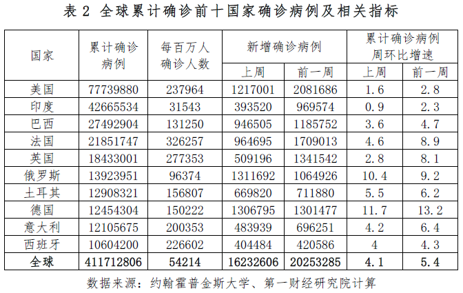 截至北京时间2月14日13点,全球新冠肺炎确诊病例为4.12亿例(约翰霍普金斯大学数据)。上周(2月7日13点-2月14日13点)全球新增确诊病例1623.3万例,较1月下旬的峰值下降了30%,疫情有缓和的趋势;新增死亡病例7.5万例,连续2周维持在7万例以上。