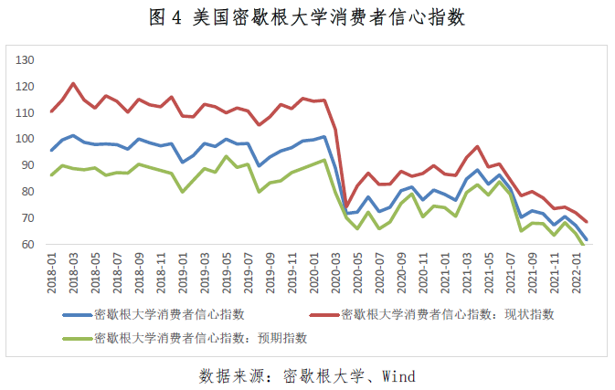 美国消费者信心进一步走弱,根据密歇根大学的数据,2月美国消费者信心指数(初值)为61.7,已连续3个月下降,创下近10年来新低。实际上,自去年4月以来美国消费者信心就呈现下降趋势,2月消费者信心现状指数与预期指数(初值)已降至疫情暴发以来最低。通胀走高是消费者信心弱化的主要原因,消费者预计未来一年通胀率为5%,较1月高0.1个百分点。