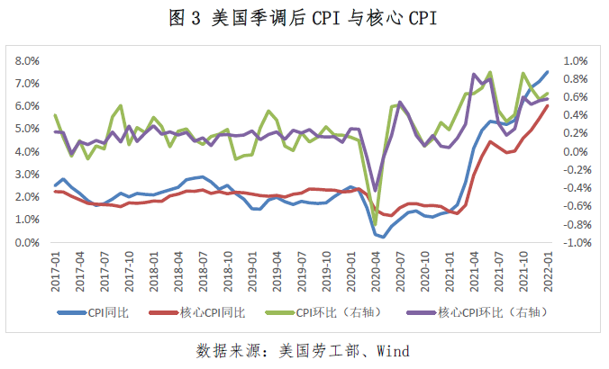 2022年1月美国通胀数据再次刷新纪录,季调后CPI(同比7.5%)、核心CPI(同比6.0%)同比数据双双创下近40年新高,疫情以来美国消费强劲复苏与供给瓶颈是导致通胀走高的主要原因。从环比增速看,1月CPI、核心CPI增速并没有放缓的趋势,二者连续两个月维持在0.6%,这一水平约为2019年均值的3倍。