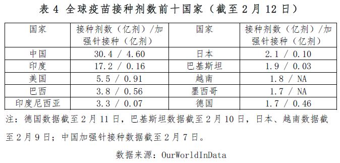 根据OurWorldInData的数据,截至2月12日全球新冠肺炎疫苗累计接种103.5亿剂,过去一周新增接种1.9亿剂,处于近半年来的低位,其中约三分之一为加强针接种。