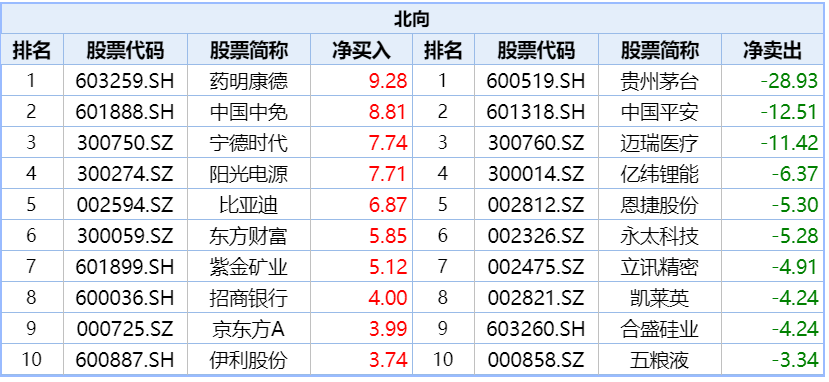 Wind数据显示,北向资金近7日回流多只赛道股,药明康德、中国中免、宁德时代、阳光电源、比亚迪获净买入居前,金额分别为9.28亿元、8.81亿元、7.74亿元、7.71亿元、6.87亿元;贵州茅台、中国平安、迈瑞医疗、亿纬锂能、恩捷股份遭净卖出居前,金额分别为28.93亿元、12.51亿元、11.42亿元、6.37亿元、5.3亿元。