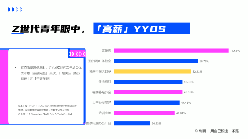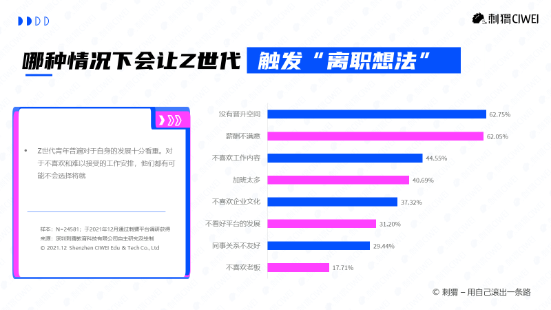 这个数据在现实中是得到印证的,00后最在乎的其实不是金钱,而是没有晋升空间。也就是说,00后可以忍受现在的辛苦,也可以忍受对薪资暂时不是很满意,但是要给他一个通道,能通过自己的努力感受到进步和成就感。而且反馈是需要及时的。