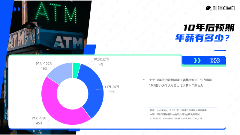 互联网上曾有过热议:有一半的95后和00后相信自己未来年薪能达到百万。我们这里调研的结果还是比较理性的,大部分同学认为自己的年薪应该在20万-50万之间,4%的同学认为自己10年后的年薪还在10万以内,但也有16%的同学认为自己10年后的年薪会超过50万,甚至可以达到年薪百万。