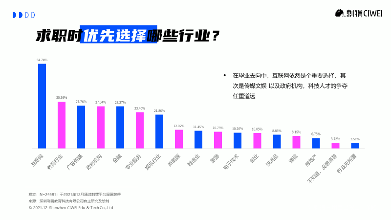 工作选择是刺猬每年调查都会首要提出的问题。可以清晰地看到,互联网依然排在第一名,并且遥遥领先于第二、三名的教育行业和广告传媒行业。很多人可能会疑惑:最近互联网大厂纷纷优化,为什么这些孩子还趋之若鹜?