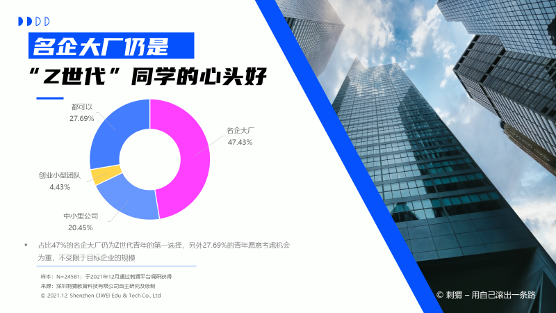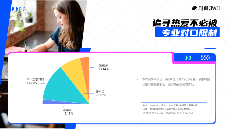 关于就业和专业的匹配关系,之前每年都会有很多线下数据,在疫情之前长期的数据显示,只有15%的同学坚持工作要和专业对口。但是2021年发生了一个有趣的变化,明确表示要找对口工作的同学达到了28.95%。