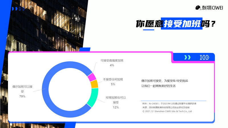 这应该是大家非常想了解的话题,从数据上可以看到有4%的同学激情地表示,可以接受高强度加班;也有5%的同学非常坚定地表示,不接受任何加班;但大部分同学选择了一个相对弹性的答案:我可以接受偶尔加班。不难看出,疯狂而激情的“996时代”确实已呼啸而过了,00后更希望保持工作和生活的平衡。