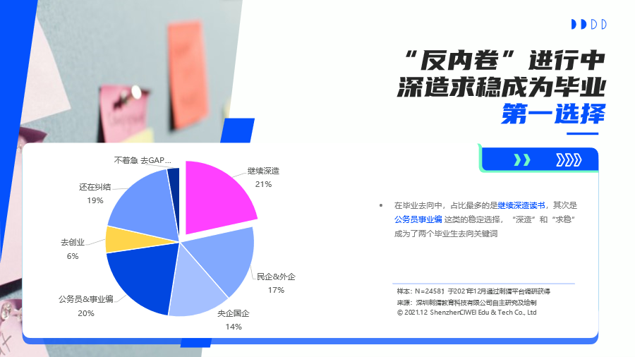 今年(2021年)毕业后选择创业的人数比例从9%降到了6%,想去央企和考公务员编制的比例则上升到34%,这些变化都不让人意外。但是,还在纠结的同学从去年的15%增加到了19%,迷惘的比例增加了。“不着急,我要去Gap(休整)”的比例从去年的9%下降到3%,疫情的影响让在校同学也深深地感受到了生活的压力,所以很多人放弃了Gap的想法。