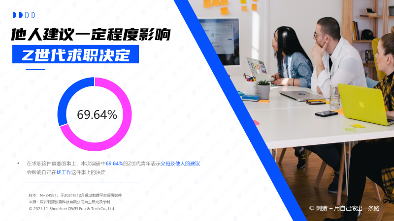 在做出最终的决策前,他需要和家里进行沟通,做出一个来自家庭的选择。从数据上可以看到,有将近70%的同学表示父母和他人会影响自己找工作的决定。这不能简单理解为服从,他们不会像70后、80后那样,自己背着包就下深圳闯荡了,而是更会考虑家庭的期望,也会减少冒险的冲动,这是时代的变化。