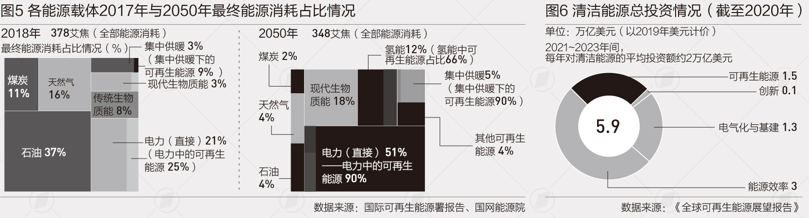 国际可再生能源署的数据显示,截至2020年,各国对清洁能源的投资累计达5.9万亿美元。这笔投资的一半(3万亿美元)聚焦改善能源使用方面,而真正对于可再生能源的投资仅为1.5万亿美元。另有1.3万亿美元用于基建和电气化改革。国际可再生能源署预测,在2021~2023年间,国际社会对于可再生能源的投资会以年均2万亿美元的速度增长。