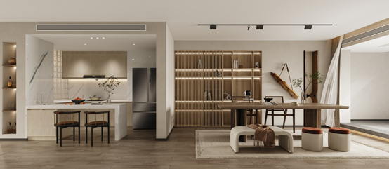 毛坯房装修,往往最考验设计师的空间整合能力,怎么利用承重墙?把生活功能聚合起来,又不乏舒适度?尤其班先生的新家还是负一、负二两层地下空间,要满足夫妻二人休息和一家人的互动,采光和防潮这两大问题也必须要在设计细节中着重解决掉。