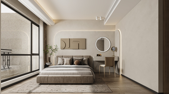 主卧也是以米白和大地色为基础色调,微水泥墙面自然形成的肌理感细腻、素净,质朴的氛围被弧形灯带隐隐的光照放大、延展,铺满整间卧室。