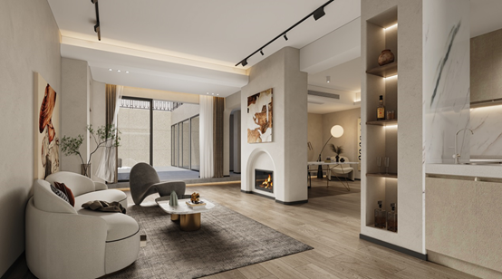 圆弧打磨的墙体,墙角的壁炉,层层弱化了水泥墙的坚硬和冰冷;还与对侧弧形沙发呼应,线条流动、火苗跳动,邀朋友父母来小坐一会,欢声笑语,好不热闹。