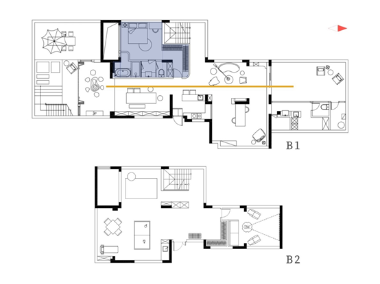 ①. 负一层以南北向轴线,左静右动划分生活区,右侧动区南北通透,重点解决了采光难题;