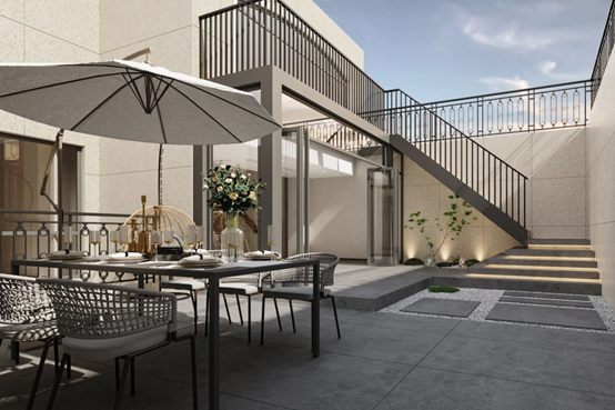 跨出门槛便移步到南花园,秦设计师在入口处做了玻璃顶棚,透光、防雨,还是从户外通往一楼的主要通道。户外花园 - 底楼起居室 - 一楼客厅,三个空间自然地串联起来。
