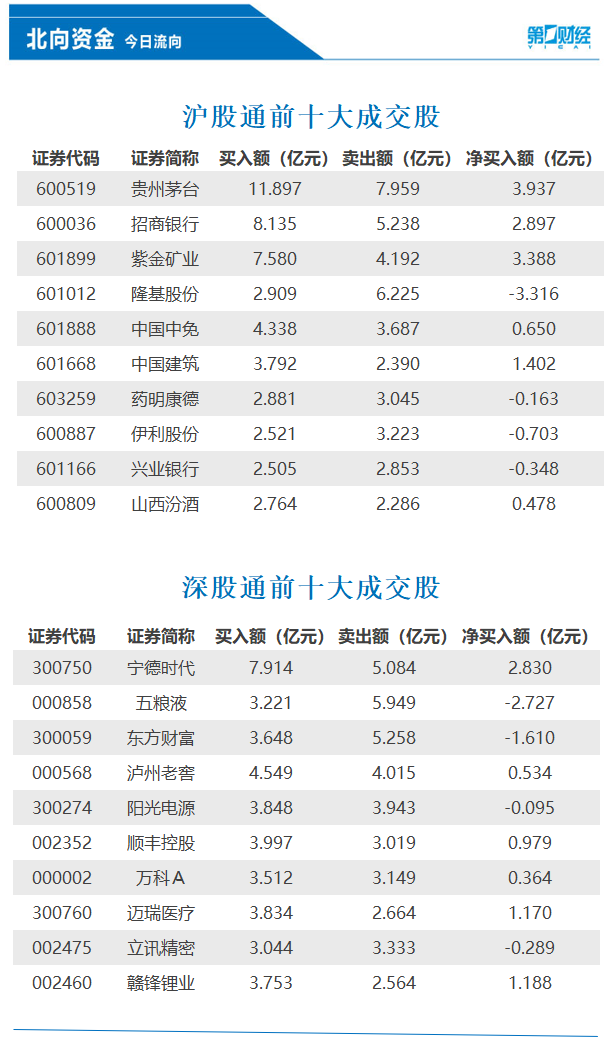 前十大成交股中,贵州茅台、紫金矿业、招商银行净买入额位列前三,分别获净买入3.94亿元、3.39亿元、2.90亿元。