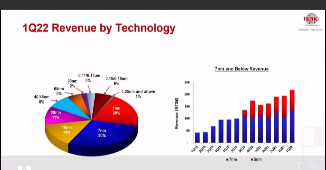 先进制程5纳米和7纳米上的优势成为台积电营收的主要动力。根据台积电最新财季的表现,5 纳米制程出货占台积电2022 年第一季晶圆销售金额的 20%,7 纳米制程出货占全季晶圆销售金额的 30%。总体而言,先进制程(包含 7 纳米及更先进制程)的营收达到全季晶圆销售金额的 50%。