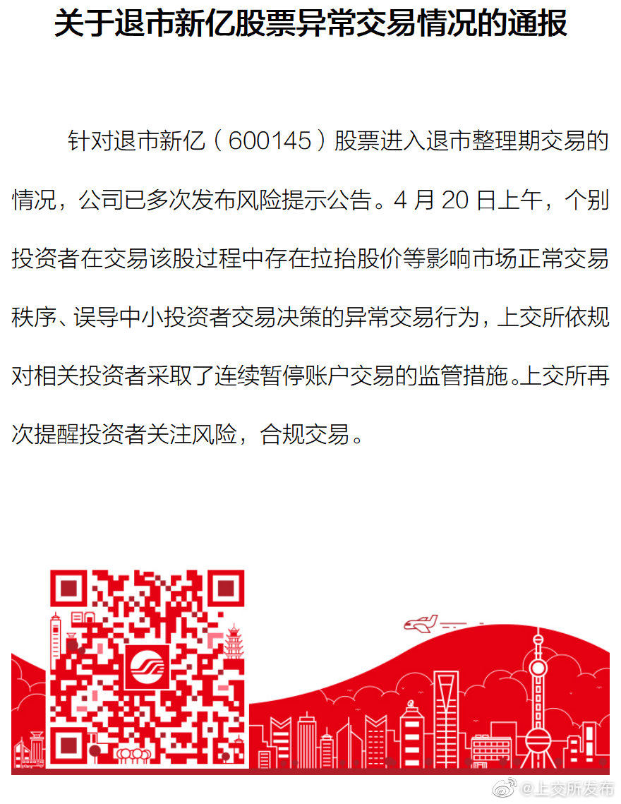 4月20日,上交所发布关于退市新亿股票异常交易情况的通报指出,个别投资者在交易退市新亿过程中存在拉抬股价等影响市场正常交易秩序、误导中小投资者交易决策的异常交易行为。