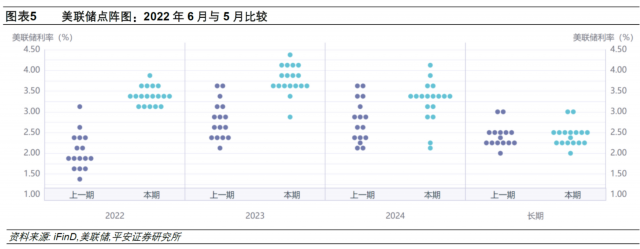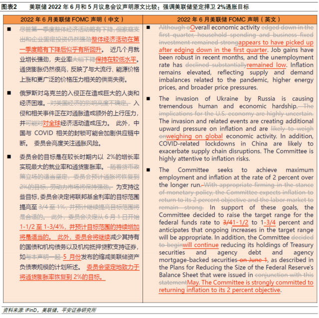 2、声明表述:美联储6月声明中有关经济和通胀的表述改动不大:删除了“劳动力市场将保持强劲”,新增“委员会坚定地致力于将通胀恢复到2%的目标”。这或反映出,美联储认为需要向市场传递更坚定的态度以遏制通胀,在当下把“胀”放在关键位置,尽量避免谈论有关“滞”的问题。