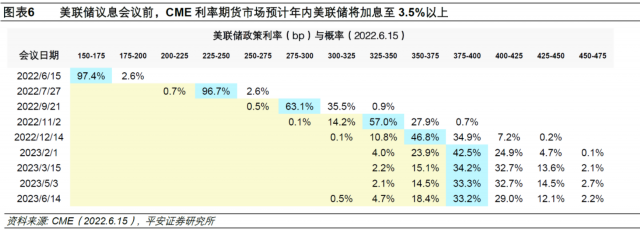 美联储点阵图基本符合6月议息会议前的CME市场预期:截至6月15日(美联储会议前),CME利率期货预计全年加息至3.5%以上的概率约为90%,2023年大概率将保持在3.75%以上。
