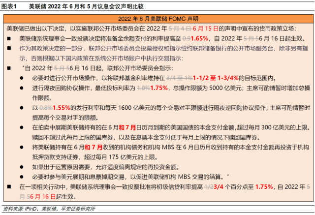 1、货币政策:宣布上调联邦基金利率75bp至1.50-1.75%目标区间,符合近一周CME利率期货市场预期,但显著超出一周前的市场预期和美联储5月会议的引导。缩表方面,美联储将继续按照原有计划,在6月和7月被动缩减每月300亿美元国债和175亿美元机构债券和MBS。
