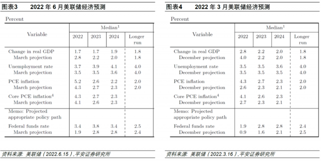 3)通胀,进一步上调2022年PCE同比增速预测0.9个百分点至5.2%,小幅上调同期核心PCE同比增速0.2个百分点至4.3%;基本维持2023年和2024年PCE及核心PCE预测分别在2.6-2.7%和2.2-2.3%水平,仍然预计长期通胀可回归至2%的理想水平。我们认为,在俄乌冲突后全球通胀风险上升的背景下,美联储继续上调今年的标题(headline)通胀指标,已经呈现出更多“谦虚”之姿。同时也说明,美联储暂不追求年内通胀率大幅回落至2%,但希望看到通胀回落的积极进展,同时对核心通胀的回落较有信心,因为货币政策对核心通胀(需求因素)更有把握。