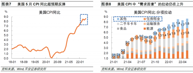 一是,美国5月CPI数据超预期走高,美联储加息的紧迫性更强。美国5月CPI同比(非季调)达8.6%,超过3月8.5%的前高,打破了“通胀见顶论”。从分项看,排除能源、食品以及与供给因素更相关的二手车卡车、运输服务分项,剩余部分(包括住房租金以及“其他”)对通胀率的拉动仍在上升,美联储有必要继续“出手”为需求因素引致的通胀降温。