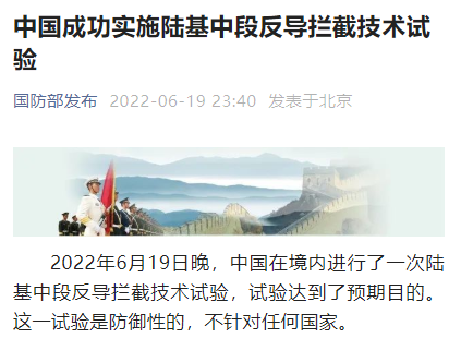 据国防部发布,2022年6月19日晚,中国在境内进行了一次陆基中段反导拦截技术试验,试验达到了预期目的。这一试验是防御性的,不针对任何国家。