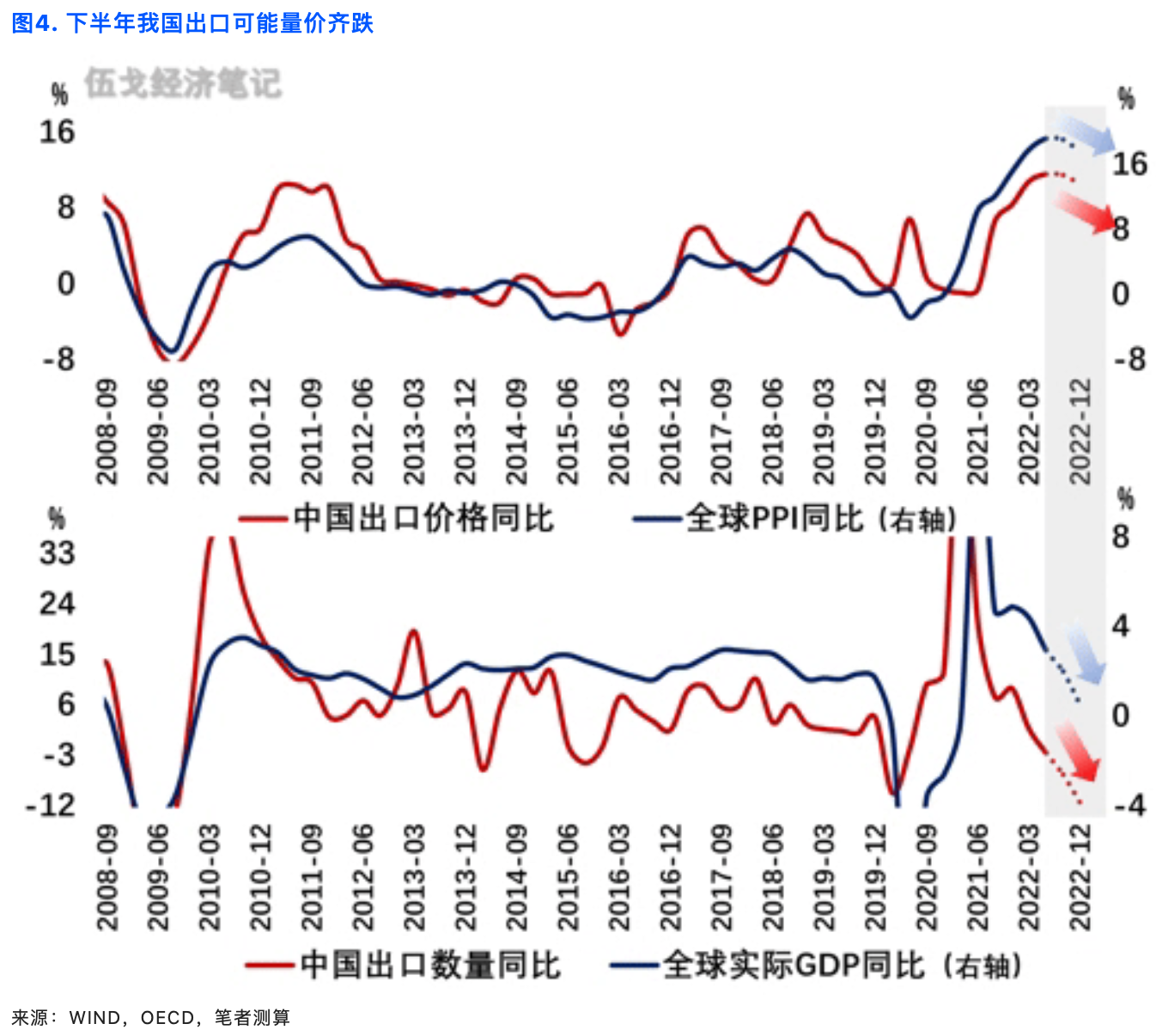 决定我国外贸的力量,将由前期高企的出口价格转向加速回落的外需数量,这会加大我国稳增长难度。尽管我国与海外周期有错位,却未必能独善其身。