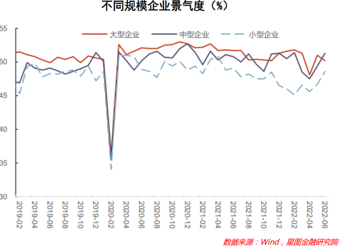 不同规模企业的景气度出现了分化。6月大、中、小型企业PMI分别为50.2%、51.3%、48.6%,其中大型企业PMI虽然仍处于荣枯线以上的扩张阶段,但相比5月下降了0.8个百分点,表明大企业的景气度有所下降,原因可能在于近期上游原材料价格下行带来的影响。中、小型企业景气度则分别上升 1.9 个百分点,但小型企业仍处于荣枯线以下。表明小企业不仅受到疫情的冲击和影响更大,持续时间也更久,更难以恢复。同时,中小企业是提供就业的主体,叠加毕业季的影响,使得当前“稳就业”面临较大的压力。因此后续对小微企业困难的解决或许仍为政策重点。