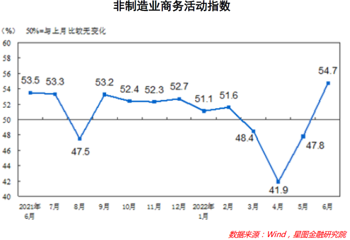 随着上海及各地方疫情封控措施的解除,服务型的需求在快速恢复,全面进入扩张期。6月,非制造业商务活动指数为54.7%,比上月上升6.9个百分点,重返扩张区间,非制造业景气水平连续两个月明显回升。