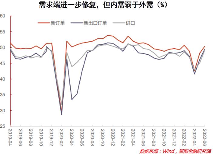 从外需角度看,6 月制造业新出口订单指数为 49.2%,较上月回升 3.3 个百分点。虽然仍在荣枯线以下,但提升幅度较大,高于新订单2.2个百分点的提升幅度,这表明短期内出口增速仍然保持强劲。