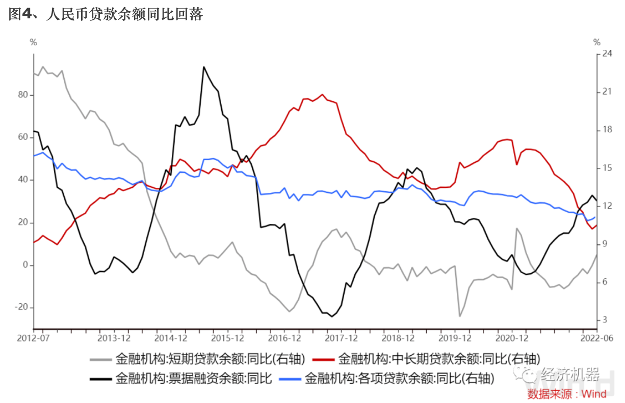 3)余额同比看,人民币贷款整体提速,信贷结构较好。6月,各项贷款余额同比增长11.24%,增速较上月增长0.24个百分点,已连续2个月正增长。分项看,中长期贷款余额同比增长10.5%,较上月提升0.3个百分点,2020年10月以来的下跌趋势有望扭转(图4)。短期贷款继续发力,今年疫情以来连续第3个月攀升。票据融资增速则年内首次回落。未来随着实体经济需求恢复,票据融资回落、信贷结构改善的趋势有望持续。