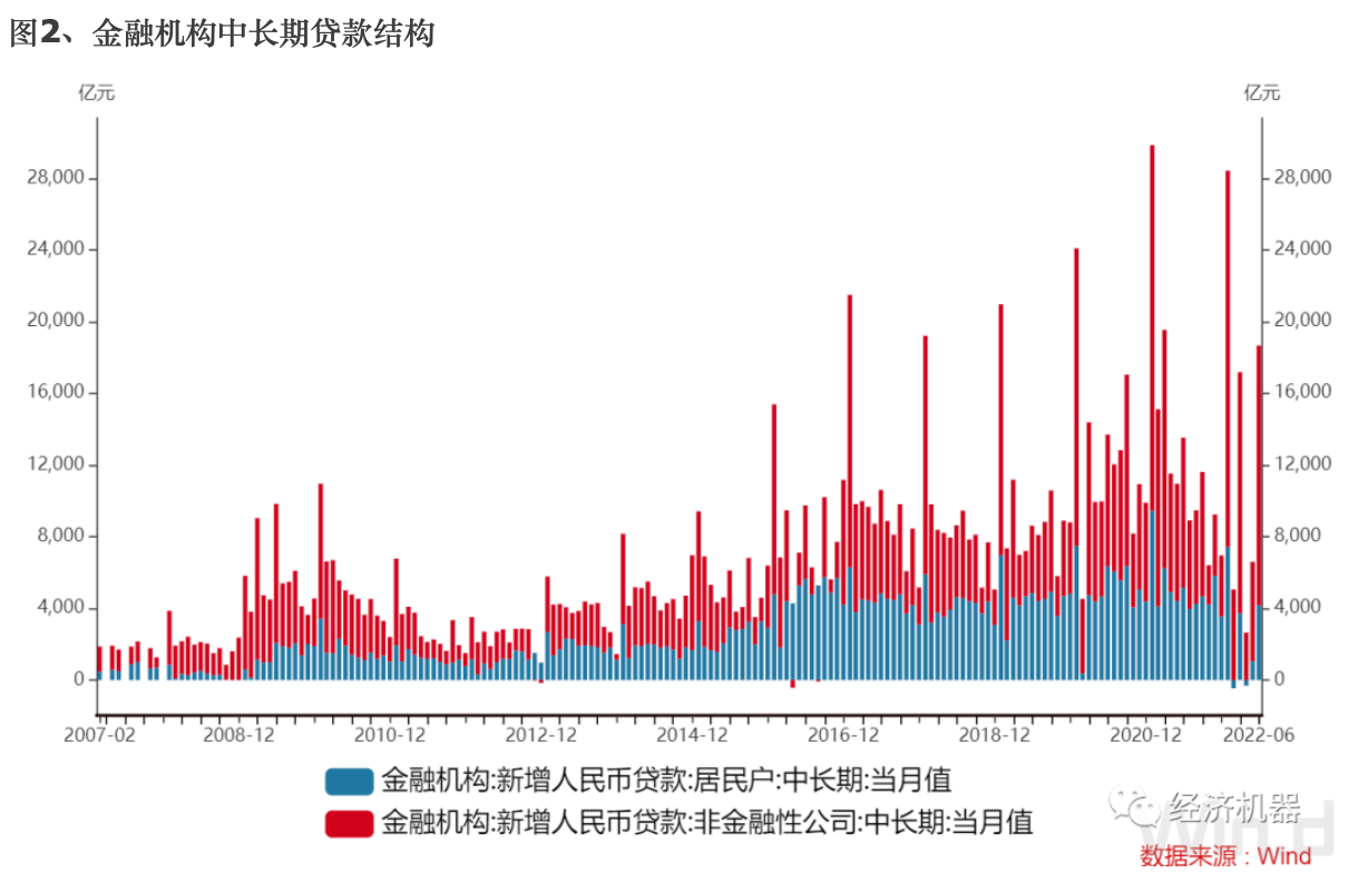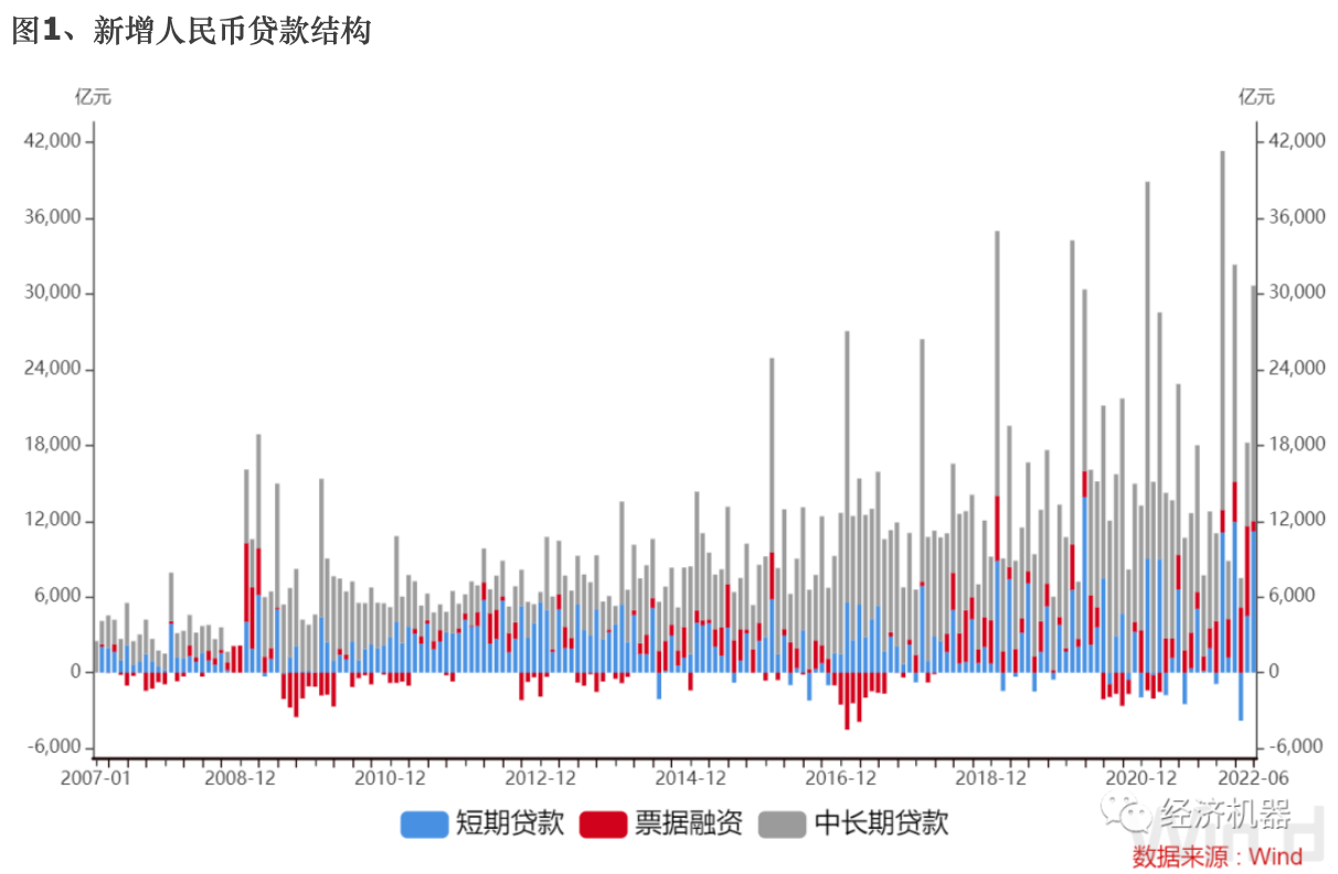 1)6月份新增人民币贷款总量同比、环比大幅走强。6月人民币贷款新增2.81万亿元,同比多增6900亿元,环比多增9200亿元,环比多增幅度创同期十年来新高。分拆来看(图1),中长期和短期贷款为主要拉动项,同比分别多增5140亿元与4596亿元,表明政策发力下,信贷结构持续优化。在主管部门持续动员下,金融机构放贷积极性大幅提高,叠加稳增长政策下基建等发力,共同推升了人民币贷款的新增规模。