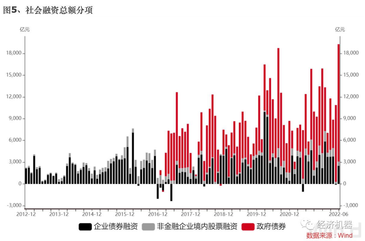 4)人民币贷款和地方专项债爆发,推动社会融资总额大幅增加。6月份,社会融资规模新增5.17万亿元,同比多增1.46万亿元。分项来看,人民币贷款新增3.06万亿元,同比多增7409亿元;地方债券新增1.62万亿元,同比多增8676亿元,是主要拉动项(图5)。